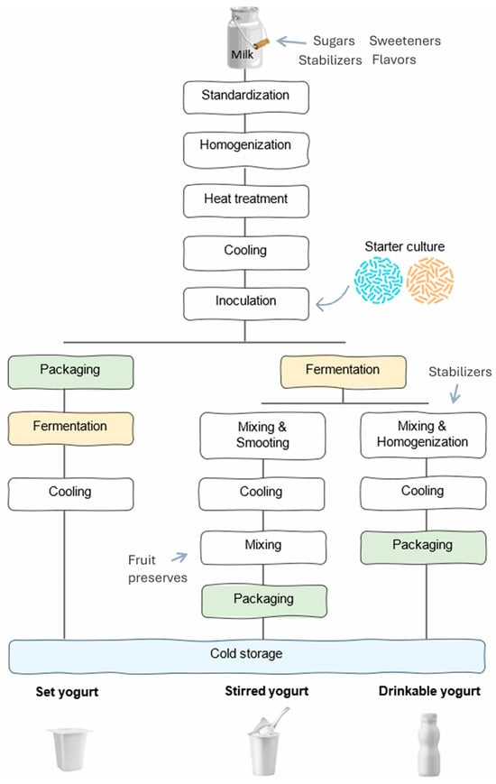 Yogurts can be produced in three ways: to make set, stirred, and drinkable products (Figure 1) [20]. These products are classified according to their physical nature (fluid-like, semi-solid, or solid), chemical composition (whole-, low-, and non-fat), flavor (plain and flavored), and style (e.g., Greek yogurt). Although there are differences in the production of these yogurts, the main steps are the same: milk standardization, homogenization, heat treatment, milk incubation and fermentation, cooling, and storage. Yogurts can contain chemical additives in their formulations to improve various properties, including physicochemical, textural, sensorial, rheological [3], and microbiological characteristics. Stabilizers, flavors, preservatives, thickeners, and colorants are some examples of synthetical additives added to yogurt, which are used to address the challenges encountered in its production and satisfy consumers’ needs. As observed in Figure 1, additives and fruit preserves can be added to yogurt at different stages of the production process [20].
