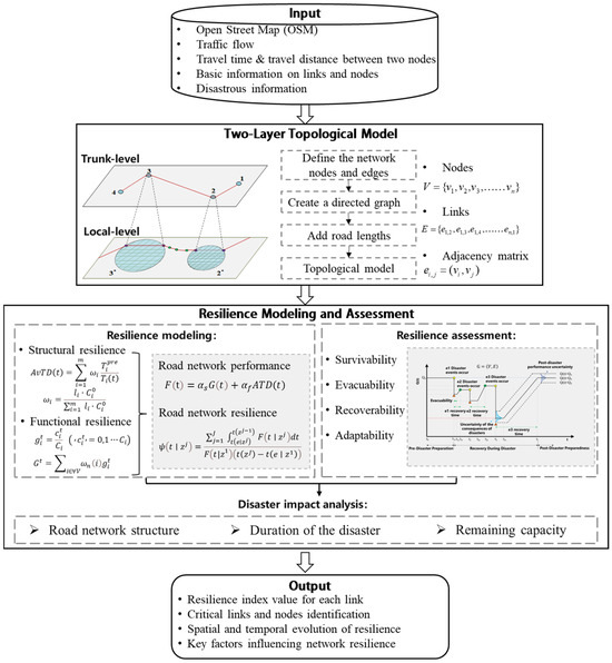 This study proposes a comprehensive framework for evaluating the resilience of sparse road networks in high-risk geological disaster areas. As shown in Figure 1, the methodology consists of three main steps: (1) developing a hierarchical road network topology based on trunk-level and local-level networks, which captures the layered structure of transportation systems in mountainous regions; (2) defining road network performance by integrating structural metrics (e.g., graph-based connectivity) and functional metrics (e.g., average travel delay (AvTD)), providing a dynamic assessment of network functionality over time; and (3) simulating disaster impacts and recovery processes to evaluate changes in network topology and performance under different scenarios, considering factors such as road network structure, disaster duration, and remaining capacity. This framework enables a systematic evaluation of road network resilience, offering insights for disaster mitigation and infrastructure planning.