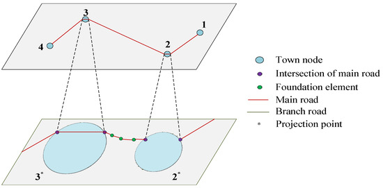 Based on the Barabási-Albert (BA) model [40] and multi-dimensional variable space models [41], this paper views the sparse road network system as a multi-layer network. To account for heterogeneity between different layers, a dual-layer network theory is employed to represent the trunk layer and local layer road networks. The upper layer represents the trunk layer road network, while the lower layer represents the local layer road network. The switching between the trunk network and the local network is facilitated through intersections, forming a connecting cross-layer network as illustrated in Figure 2.