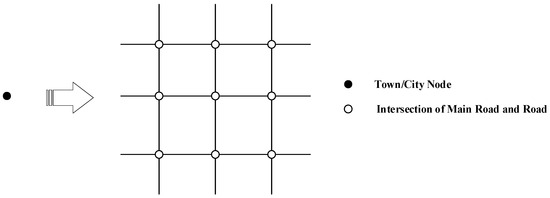 The local node topology is an enlarged version of the trunk layer network’s node topology. It represents a local network within the trunk layer network node that has independent traffic properties, including more nodes and edges. The nodes refer to intersections within the local road network, while the edges represent road connections within the local area, including county roads, streets, and alleys within the city. Figure 4 illustrates the local node road network topology model.