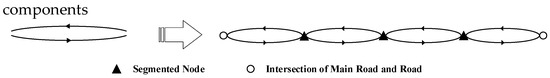 The local segment topology is an enlarged version of the trunk road network segment topology. In a real traffic network, due to geological disasters, traffic control, or construction work, certain sections may be closed, or entire segments may be nonexistent or individually closed. This connectivity information must be flexibly configured in the topology to accurately describe the sparse road network topology. Additionally, due to local traffic control (speed/weight limits), topographic features, and changes in road alignment conditions can result in bridges, tunnels, and short road segments having inconsistent infrastructure conditions compared to adjacent road facilities. To accurately represent the network state, these differences must be stored as segmented data across distinct road sections. Consequently, components or sections are used as the smallest modeling units. In sparse road networks, bridges and tunnels are not merely infrastructure components but are often modeled as critical nodes in network topology due to their significant impact on connectivity and functionality when disrupted. Thus, in our topological modeling approach, bridges and tunnels are uniformly abstracted as critical nodes. This means that nodes represent bridges, tunnels, topographic feature boundaries, road alignment change points, and segment connectivity points caused by disaster events. Figure 5 illustrates the local segment road network topology model.