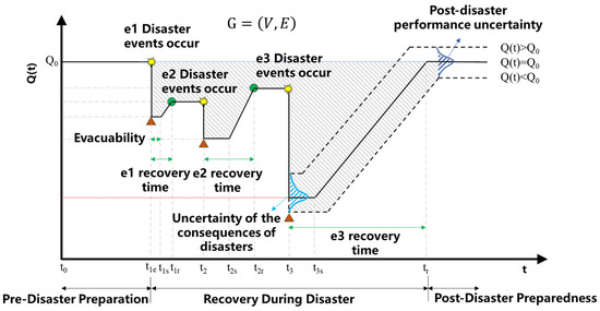 Frequent geological disasters within a short period can severely impact the performance of sparse road networks. Compared to road networks affected by a single disaster, the usability of the network significantly decreases. Networks affected by a single disaster often do not consider the scenario where multiple links are continuously damaged before complete recovery, and they assume that disaster events occur simultaneously. However, in extreme environments, sparse road networks emphasize the continuous implementation of emergency recovery strategies in response to ongoing disaster events. Once major infrastructure is significantly damaged, repairs may take months or longer. Thus, the performance of sparse road networks is in a state of dynamic change over a long period, and its resilience concept differs greatly from the conventional resilience triangle, as shown in Figure 6.
