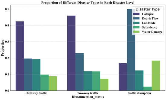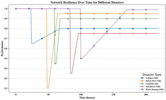 From Table 5, it can be seen that the resilience of the sparse road network during collapse events is relatively high (0.6880), with good adaptability (0.80) but slow recovery speed (0.047). Frequent collapses in sparse road networks require large equipment to handle falling rocks, resulting in longer disaster durations. Debris flows have low survivability (0.45) but fast recovery speed (0.075) and adaptability (0.55). Subsidence disasters show moderate survivability (0.35) and evacuability (0.62), with a fast recovery speed (0.04) and good adaptability (0.65). Overall, the resilience is relatively balanced, exhibiting some recovery capability within the sparse road network. Water damage shows moderate survivability, a slow recovery speed, and moderate adaptability. Due to the long disaster duration, the overall resilience is the lowest.