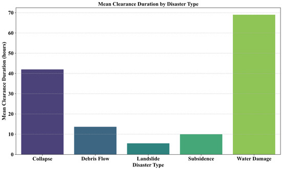 The duration of the disaster, disaster type, and remaining traffic capacity significantly impact network resilience. In the case of partial blockage, sparse road networks exhibit higher evacuability and adaptability, achieving the highest overall resilience (0.7294). However, as disaster duration increases, network resilience notably decreases, with a nearly 10% drop in resilience when disaster duration extends to 69 h compared to 6 h. Additionally, sparse road networks show high resilience to collapse events but have slower recovery speeds. In contrast, they have low survivability but fast recovery speed and adaptability when facing debris flows. Subsidence disasters result in moderate survivability and evacuability, fast recovery speeds, and relatively balanced overall resilience. Water damage events lead to the lowest overall resilience.