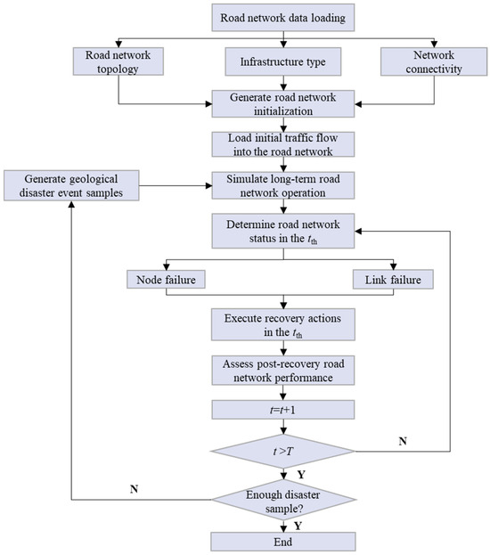 Previous research on the resilience of transportation networks has primarily focused on the development of frameworks for quantifying and optimizing the resilience of urban roads and dense networks [9,18,19]. These studies often assume that road networks operate in environments with infrequent natural disasters, such that disaster events occur simultaneously, and that the service functionality of segments or nodes is completely disrupted [20]. However, these assumptions do not always reflect reality, neglecting the unique challenges faced by sparse road networks, including the frequent occurrence of geological disasters, limited recovery resources, and the lack of alternative routes. Additionally, existing methods often lack dynamism, making them ineffective in predicting and adapting to the temporal variations and impacts of geological disasters.