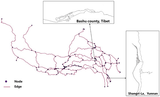 Sparse road networks are typically bidirectional and consist of two lanes. Therefore, the topology of such networks can be simplified into an undirected graph model using graph theory, represented as , where denotes the set of network nodes, including bridges, tunnels, and intersections, and represents the set of all travel paths. The performance indicators of a sparse road network, AvTD, can be expressed using Equations (1) and (2):