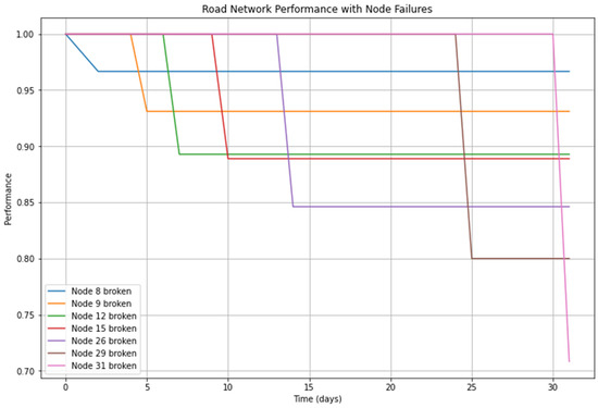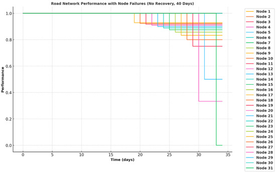 In the early stages of damage, Nodes 1 to 7 are destroyed. Although the damage to these nodes results in some performance decline, it does not lead to severe network failure, thus having a relatively minor impact on the overall performance of the sparse road network. However, the destruction of Nodes 9 to 16 significantly accelerates the decline in network performance. In the later stages, the destruction of Nodes 17 to 31 fragments the network into multiple isolated segments, severely affecting its usability and connectivity, causing a sharp performance decline, approaching zero.
