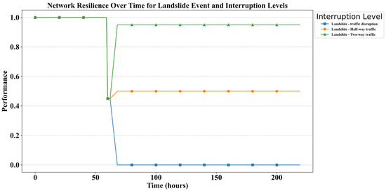 The resilience levels of the road network are simulated under three scenarios, i.e., complete blockage, partial blockage, and two-way traffic, caused by a landslide event (Figure 20).