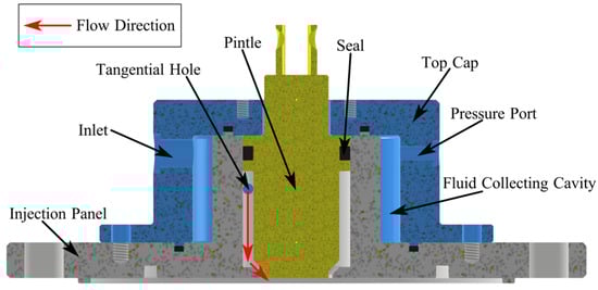 As delineated in Figure 1, the pintle-centrifugal injector is an assembly comprised of the injector panel, the injector’s upper cap, the pintle mechanism, and the dynamic sealing system. Incorporated within the pintle, beneath and central to the injector panel, are conical surfaces configured at uniform angles. The axial displacement of the pintle modulates the gap between these conical surfaces, thereby varying the cross-sectional area available for injection. This dynamic adjustment enables the regulation of the pressure differential across the injector for diverse flow rates. Furthermore, the dynamic seal serves a critical function, ensuring a hermetic interface between the pintle and the injector panel throughout the pintle’s range of motion, precluding any potential fluid leakage.