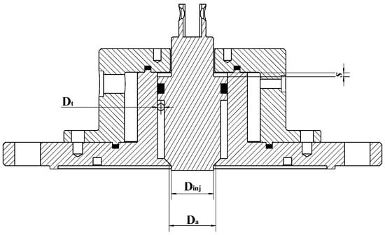 As delineated in Figure 2, the pivotal structural parameters of the throttleable pintle-centrifugal injector designed for empirical evaluation are systematically enumerated. Within this figure, the variable s signifies the traversal range of the pintle mechanism. The count of tangential apertures within the injection panel is denoted as N, and Dt signifies the internal diameter of these orifices. Moreover, Dinj represents the diameter at the pintle’s nadir, cooperating with the injection panel’s internal diameter Da, constitutes the annular injection slit. The pintle adjusts the annular slit, formed by the injection panel’s internal diameter (Da) and the pintle’s nadir diameter (Dinj). At a pintle stroke of s = 0 mm, the slit is closed, ideally sealed, and opens progressively as s increases. Additionally, the angular disposition of the injection channels is indicated by θ. A comprehensive tabulation of these parameters is provided in Table 1. The size and scale of our injector were constrained by the experimental capabilities of our laboratory and the requirements of a standard engine test article, leading to the selection of the current dimensions, with studies conducted to investigate the effects of varying tangential hole sizes. Furthermore, the actualized physical assembly of the throttleable pintle-centrifugal injector and the pintle apparatus is depicted in Figure 3.