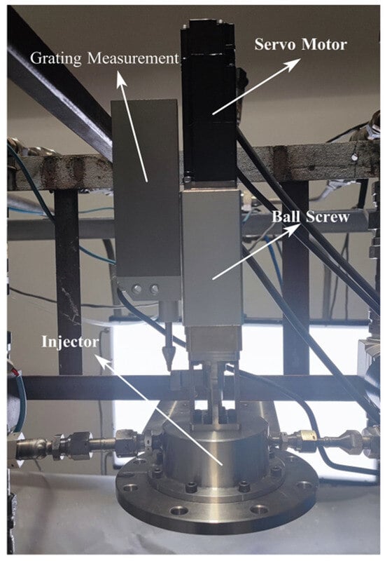 As shown in Figure 4, the throttleable pintle-centrifugal injector actuator is primarily composed of servo motors, ball screws, a grating measurement system with a resolution of 0.001 mm, and corresponding control software (Written by LabVIEW2020). The grating measurement system, with its high resolution, plays a crucial role in precisely measuring and displaying the stroke of the pintle. This system ensures accurate displacement measurement by providing real-time feedback, allowing for fine control of the pintle position and precise monitoring of its motion throughout the injection process.