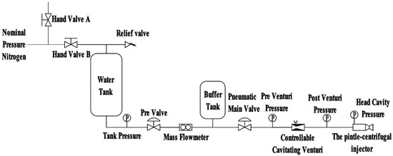 The propellant delivery system is shown in Figure 5. It consists of a hand valve, safety valve, high-pressure water reservoir, pressure sensor (range: 0–2 MPa, accuracy: ±0.25% FS), pneumatic valve, mass flow meter (range: 0–600 g/s, accuracy: ±0.1% FS), buffer tank, and cavitation venturi. The cavitation venturi is the flow control element of the delivery system, which accurately controls the liquid flow in the system under defined pressure conditions. The feeding pressure, ranging from 3 MPa to 4 MPa, was supplied upstream of the controllable cavitating venturi. While the cavitating venturi’s flow rate depends on upstream pressure (3–4 MPa) to sustain cavitation, the choked throat, under sonic conditions, stabilizes the downstream pressure near the fluid’s vapor pressure, providing a consistent boundary for the injector. This isolates the injector’s performance—pressure drop and atomization—from upstream pressure variations, aligning with our focus on downstream dynamics. Under cavitation, the venturi throat maintains a stable pressure, decoupling the upstream feeding pressure from the injector’s performance, making it a non-critical parameter for the observed pressure drop and atomization results.