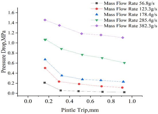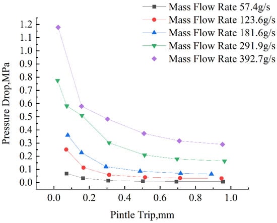 Flow tests were carried out for the throttleable pintle-centrifugal Injector 1 in the deionized water mass flow range 57.3–392.7 g/s. The pressure drop was measured using a piezoresistive pressure sensor (±0.25% FS) at pressure taps located in the fluid collecting cavity, as shown in Figure 1. This pressure governs the propellant’s exit velocity, a key metric for injector evaluation, ensuring stable injection and enhanced atomization. The injection pressure drop of the injector was adjusted by varying the pintle stroke at different mass flow rates. The relationship between the injection pressure drop and the pintle stroke at different mass flow rates is shown in Figure 6. The pressure drop measurements were recorded with a pressure sensor accurate to ±0.25% of full scale. Given the high precision of the sensor, the uncertainty in the measurements has a minimal impact on the experimental data. The accuracy of the sensor ensures that the recorded pressure drops are reliable, and the effect of measurement uncertainty on the overall results is negligible.