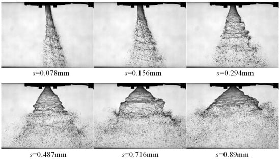 Figure 8 shows the injection flow field at different strokes for the same flow rate of 181.6 g/s in the test of Injector 1. Due to mechanical problems with the throttleable pintle-centrifugal, the eccentricity of the jet field appears after assembly. However, this eccentricity allows the centrifugal phenomenon to be better observed. Even in the case of the pintle bolt stroke s = 0.078 mm, the throttleable pintle-centrifugal injector jet flow field still has a clear rotational motion.