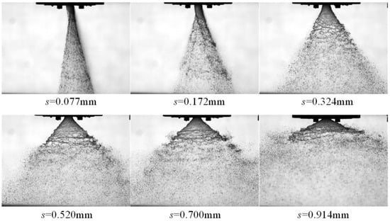 A comparable phenomenon is observed in the tests conducted with Injector 2, wherein the liquid film formed by Injector 2 is of shorter duration at the corresponding needle bolus stroke, and the media atomization occurs at an earlier stage, as illustrated in Figure 9. This is attributable to the reduction in the diameter of the tangential holes, which permits the water to swirl at a greater rate subsequent to passing through the tangential holes. In different application scenarios, the use of varying tangential hole sizes can facilitate the regulation of the core area of atomization.