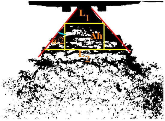 In the analysis of the atomization angle, a series of images captured by high-speed photography are first superimposed. The binarised images are obtained by means of a threshold segmentation method. The atomization angle is then determined according to the method mentioned previously. The method for obtaining the spray angle is shown specifically in Figure 10, and the atomization angle has Equation (2) to calculate it.
