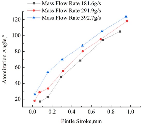 Through the above process, the atomization angle parameters were obtained for all operating conditions. The atomization angles at different flow rates were analyzed in relation to the pintle stroke and plotted in Figure 11. The graph shows that at the same flow rate, the spray angle increases significantly with increasing pintle stroke.