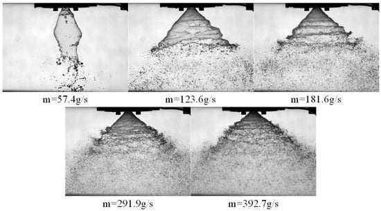 When analyzed for a fixed pintle stroke, the atomization angle increases as the flow rate increases for the same stroke. This is in line with conventional knowledge. The increased flow rate increases the velocity of the fluid, both axial and radial. Figure 12 shows images of the atomization corresponding to different flow conditions at a pintle stroke of around 0.7 mm.