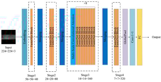 In the fourth stage, the features will already have been sufficiently extracted and processed in the previous stages. Therefore, further increasing the number of modules would not significantly improve the model’s performance; instead, it could increase the risk of overfitting. Reducing the number of modules helps avoid excessively complex feature representations while maintaining sufficient model capacity to process global information. This approach ensures stability in the final stage and mitigates potential negative impacts on the model’s generalization ability. Hence, only two FasterNet Blocks are used in this stage to generate the final output features suitable for the recognition task.