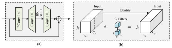 As shown in Figure 2a, the FasterNet Block consists of a Partial Convolution (PConv) layer, two convolution layers with a stride of 1, a Batch Normalization (BN) layer, and a GELU activation function. The BN layer normalizes the input features, enhancing the stability and speed of model training, while the GELU activation function improves non-linear expressiveness by smoothly activating the input, thereby enhancing model performance. To further optimize computational efficiency, the FasterNet Block employs a targeted strategy by placing the BN layer and GELU activation function only after the first convolution layer in each module. This reduces redundant computation steps and improves inference speed. Each FasterNet Block maintains the same number of channels, with channel changes occurring only between stages. This design reduces computational complexity and memory consumption while ensuring consistency in feature transmission across modules, allowing the network to better capture both global and local feature relationships and effectively extract structural information from images. Since Partial Convolution operates on only a subset of channels, a Skip Connection is used at the end of the module to fully utilize all of the channel information and prevent feature loss. The input to the Partial Convolution layer is directly passed to the final addition operation, preserving input features and fusing them with the convolution-processed features. This design enhances the model’s learning capability and stability, facilitating better retention and transmission of information in deep networks.