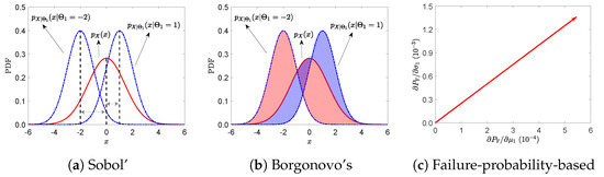 An illustration of the failure-probability-based GSI is drawn in Figure 1c, with consideration given to the toy model in Equation (10), where the failure domain is defined by .