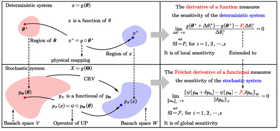 As mentioned above, an ideal GSI is expected to not only measure the importance of each model input but also characterize the direction of this importance. These two features will undoubtedly help to reflect the basic physical mechanisms of stochastic parametric models. In probability theory, it is well known that the PDF of the QoI can be uniquely defined if the studied stochastic model is well-posed and the PDF of model inputs is also precisely determined. This fact is also known as the rule of change of random variables (CRV) [37], which can be compactly expressed in an operator form; see the formula in Equation (9). In this sense, a natural GSI in terms of stochastic models can be heuristically defined as an extension of the “partial derivative” of a function in the context of the operator of uncertainty propagation (UP), as shown in Figure 2. From the perspective of functional analysis, the Fréchet derivative can perform this task in theory. In summary, based on the conceptual idea of the Fréchet derivative, the Fréchet-derivative-based GSI (Fre-GSI) can serve as a natural GSI that may be more compatible with stochastic models.