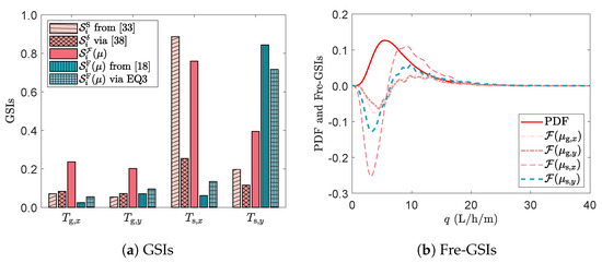 Comparing Equation (13) with Equation (14), one can see that the expression of moment-independent GSI is very similar to that of variance-based GSI. Back to the thought of fixing an input random variable (e.g., ), an intuitive understanding of the variance-based GSI and moment-independent GSI is as follows. Firstly, one can obtain the output PDF when all input PDFs are set according to the corresponding distributions, which is mathematically expressed in Equation (9). If one of the input variables is fixed at a certain value, e.g., , then accordingly, the output PDF will become conditional by . Thereupon, the effect of fixing an input variable at a certain value can be quantified by defining a distance between a quantity from the case of and that of . Hence, different distances will lead to different definitions of GSI. For the variance-based GSI, the Bregman distance is considered, while for the moment-independent GSI, the distribution distance is taken into account. Specifically, the variance-based GSI is defined by calculating the mean of Bregman distances by Equation (13), while the moment-independent GSI is based on the mean of distribution distances (the total variation distance) by Equation (14).