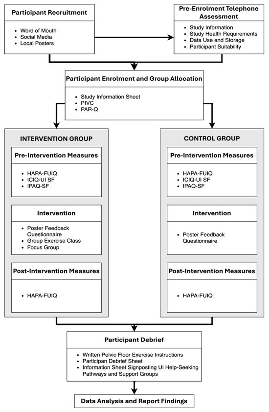 Pre-intervention measures were administered online to both groups at the same time (with a 7-day return window), and the group exercise class and focus group were scheduled for the intervention group to take place two weeks later in a suitable university room. As outlined in Table 1, both groups had similar (non-significant) baseline characteristics, showing participants engaged in PA at levels below current guidance recommendations and UI had a medium-to-high impact on quality of life.