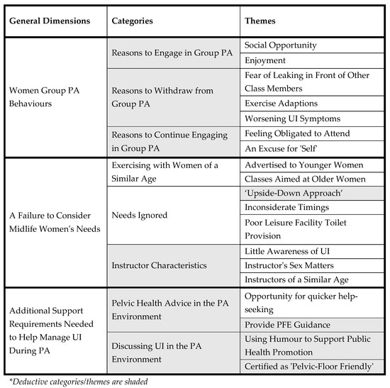 Deductive and inductive themes. Note. PA = physical activity; UI = urinary incontinence; PFE = pelvic floor exercises.