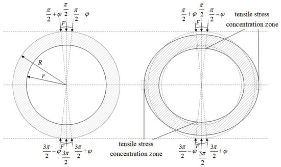 When vertical pressure is exerted to the outer wall at the top of the ring concrete structure, the inner wall at the top deforms, leading to bending tension, resulting in stress [18,19,20], as shown in Figure 1. r, R and h are the inner radius, outer radius and thickness of the structure, respectively. Additionally, the outer wall of the structure also experiences significant tensile stresses at its waist.