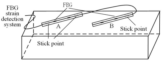 In this study, FBG strain sensors are used to measure structural strain, and the ambient temperature is measured by introducing a reference grating that only acquires temperature information [21], as shown in Figure 2. In the installation of FBG sensor, both ends of FBG sensor A are fixed to the structure’s surface to detect strain. When the structure under radial pressure is exposed to varying temperatures, its central wavelength is influenced by both the temperature and structural strain. The wavelength signal conveys information about the structural strain and the temperature. One end of FBG sensor B is fixed to the surface of the structure, while the other end is not fixed. Its central wavelength is only modulated by the temperature, and the wavelength signal carries information about temperature.