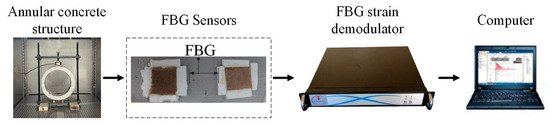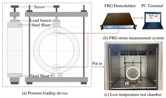 The cooling experimental setup is composed of FBG strain measuring system, displacement loading device and low temperature test chamber, as shown in Figure 9. The FBG strain sensors are arranged in the inner wall of the arch and the arch bottom, that is, the stress concentration zone of the pressure-constrained annular concrete structure.