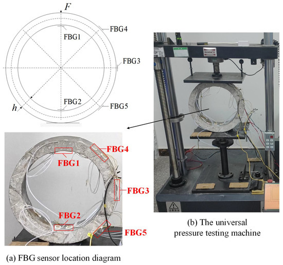 Considering the symmetry of structural loads, the FBG sensors are placed between 0° and 180° of the annular concrete structure, arranged semi-circularly as shown in the Figure 6a. FBG1 and FBG2 are positioned at 0° and 180° on the inner wall, while FBG3, FBG4, and FBG5 are positioned at 90°, 45°, and 135° on the outer wall, respectively. The universal pressure testing machine, shown in Figure 6b, is used for the experimental performance test. The load is applied along the vertical and radial direction of the concrete pipe, and the axis of the specimen is parallel to the upper and lower clamping surface.