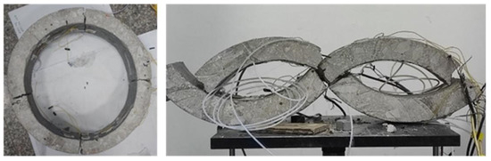 Through observation, it can be seen that when the maximum pressure that concrete can bear is exceeded, the structure suddenly breaks from the top and bottom. As the annular concrete structure continued to be squeezed by external pressure loads, due to the failure of the top and bottom, the stress on the structure along the 90° direction rapidly increased until fracture occurred. The failure state is shown in Figure 7.