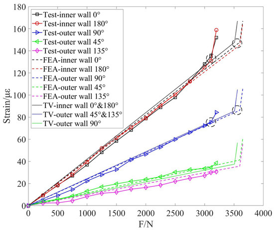 By inserting the pertinent parameters of the structure into Equation (2) reveals that the ultimate pressure the structure can withstand is 3509 N, and the theoretical value(CV)-strain curve of the structure is shown in the figure below. The simulated load-strain curve of the structure shows that when the load reaches 3598 N, the strain values at the top and bottom of the inner wall undergo a sudden change, with an error of 2.54%. The measured load-strain curve indicates that a sudden change in strain values at the top and bottom of the inner wall occurs when the load reaches 3108 N; additionally, at a load of 3140 N, the strain values at the 90 ° outer wall also show a sudden change. The results indicate that under external load, the annular structure first fails at the inner wall of the top and bottom, with a failure load of approximately 3200 N and an 8.8% error, which is within an acceptable range considering the actual test conditions. As the load on the annular structure increases, the FBG sensor has a maximum offset at 2500 N with a value of 4.75 and an error of 4.6%.