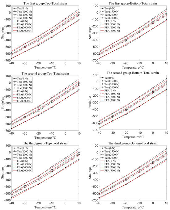 Figure 10 shows the total strain curves of two test points at the top and bottom of the three groups of ring concrete members under different pressure conditions. The red curve is the total strain simulation curve of the two measurement points under different pressure constraints. It can be seen that in the range of 10 °C to −40 °C, the total strain of the component gradually increases with the decrease of temperature. The trend of simulation results is consistent with the measured results.