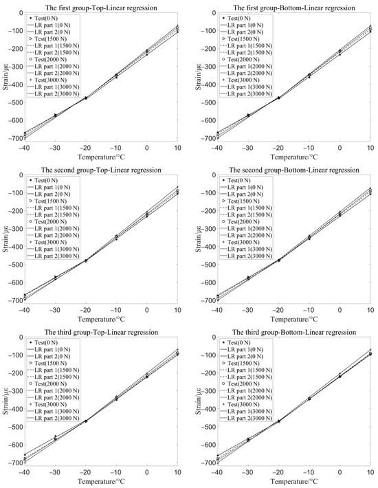 After the radial load is applied, the annular concrete structure is gradually cooled in the low temperature test chamber, and the strain changes of the FBG sensor attached to the structure were recorded and analyzed. The design temperature range of the experiment is 20 °C to −40 °C. The temperature started from 20 °C and the gradient cooling amplitude is 10 °C. To cool the concrete completely, it is necessary to stay at each temperature gradient for a period of time, and the recorded FBG wavelength is considered to be valid when it becomes stable at each temperature gradient [25]. By substituting the wavelength offset value into Equation (5), the total strain at the test point of the structure can be obtained. Set the tensile strain to positive.