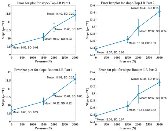 The variation of thermal strain sensitivity of the three groups of components is shown in Table 3. Figure 12 shows the mean and standard deviation of the measured slopes under different pressure conditions (0 N, 1500 N, 2000 N, and 3000 N). Each data point represents the average value from three experimental groups, and the error bars indicate the standard deviation(SD) of the experimental data under each pressure condition. By observing the data in the figure, it can be seen that the slope slightly increases as the pressure increases. The results show that under different pressure conditions, the thermal strain sensitivity of concrete increases with the gradual increase of pressure confinement. It indicates that the greater the pressure, the greater the influence on the cooling process of concrete.