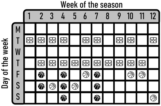 The training and game schedule for the semi-professional, female basketball players monitored in this study. Note: letters next to each row correspond to each day of the week from Monday (M) to Sunday (S) in order; court image indicates on-court team training session; shaded basketball indicates away game; transparent basketball indicates home game; all training sessions commenced at 18:30; all games on Fridays commenced at 18:30; all games on Saturdays commenced at 18:00; all games on Sundays commenced at 12:00.