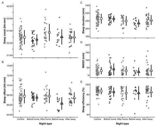 Mean ± standard deviation (large shapes and lines) alongside individual data points (small shapes) for (A) sleep onset, (B) sleep offset, (C) sleep duration, (D) wake after sleep onset (WASO), and (E) sleep efficiency across different nights according to game venue throughout the regular season in semi-professional, female basketball players.