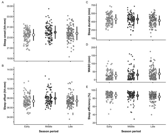 Mean ± standard deviation (large shapes and lines) alongside individual data points (small shapes) for (A) sleep onset, (B) sleep offset, (C) sleep duration, (D) wake after sleep onset (WASO), and (E) sleep efficiency across different nights according to season period throughout the regular season in semi-professional, female basketball players.
