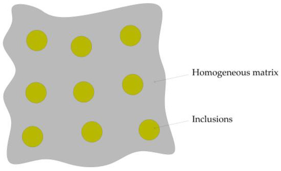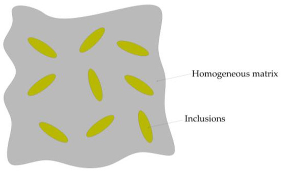 In 1973, Mori and Tanaka resolved the fundamental theoretical issues associated with the application of Eshelby’s equivalent inclusion principle in finite volume fractions by calculating the average stress within the matrix. Since then, the Mori–Tanaka model has been extensively employed to predict the effective properties of various composite materials [32]. This model assumes that the inclusions are ellipsoidal particles with random orientations and varying sizes, as illustrated in Figure 2.