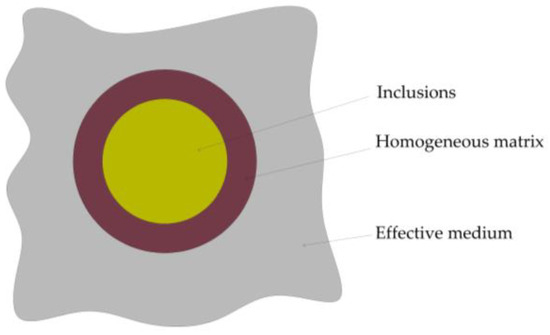 Christensen et al. proposed the generalized self-consistent (GSC) model, which is a three-phase model comprising inclusions, a matrix shell, and an effective medium. In this model, the proportion of inclusions and the matrix shell correspond precisely to the volume fraction of inclusions in the composite material [28], as illustrated in Figure 3.