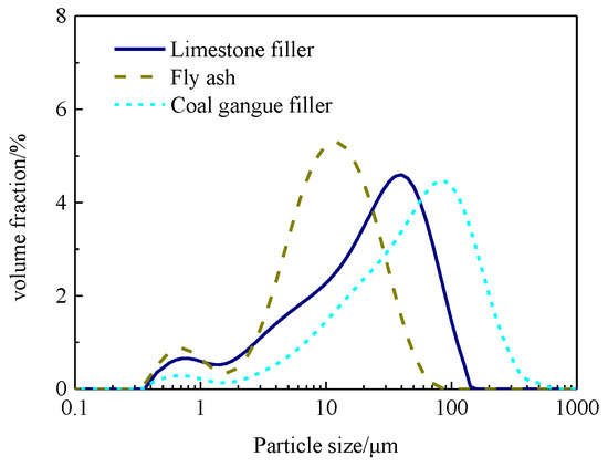 A laser particle size analyzer was employed to sequentially test the three types of mineral powders. The average of three measurements was taken to plot the particle size distribution curves, as shown in Figure 5. The results indicate that among the three types of mineral powders, the fly ash powder exhibits the finest particle size, with 90% of the particles having a diameter below 26.942 μm. The particle sizes of the three mineral powders, in ascending order, are as follows: fly ash < limestone filler < coal gangue filler.