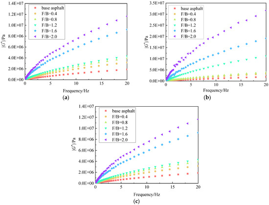 Complex shear modulus of asphalt mastic and base asphalt: (a) LAM; (b) FAM; (c) CAM.