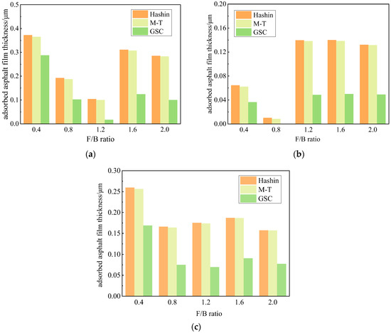 Adsorbed asphalt film thickness based on different micromechanical models: (a) LAM; (b) FAM; (c) CAM.