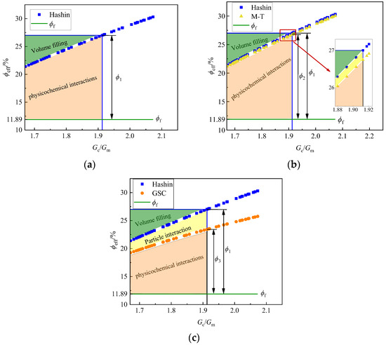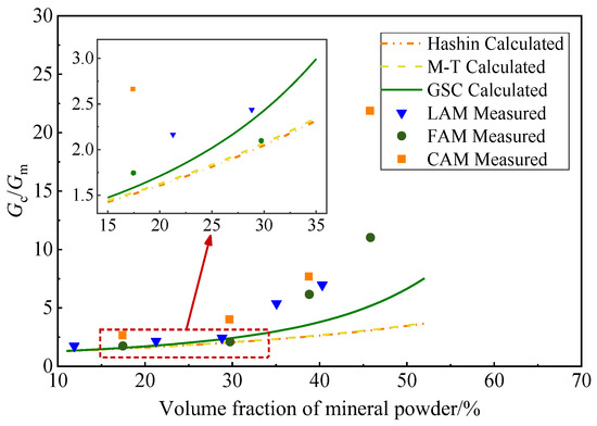 Figure 8 indicates that for FAM with a mineral filler volume fraction of 29.73%, the experimental Gc/Gm value is lower than the GSC model’s prediction. At this stage, the effective volume fraction (ϕeff) calculated using the GSC model is lower than the filler volume fraction (ϕf), resulting in the negative value observed in Figure 7b. Therefore, within a certain range of mineral filler content, the accuracy of the adsorbed asphalt film thickness predicted by the GSC model requires further validation.