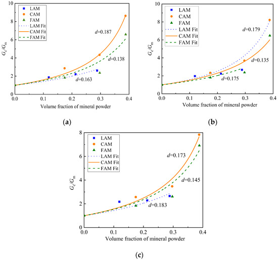 where Gc/Gm is the experimental value of the shear modulus ratio of asphalt mastic. ϕf is taken as the independent variable, the measured value of Gc/Gm as the dependent variable, and d as the fitting parameter for nonlinear fitting. To ensure that the physicochemical interactions between the asphalt and mineral filler dominate without being affected by inter-particle interactions, the volume fraction of mineral filler should be restricted within the critical volume fraction range during fitting. The fitting process is shown in Figure 10.