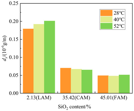 The relative content of chemical components in the three mineral fillers was determined via XRD analysis. The diffraction peak patterns of the XRD results were integrated, and the relative content of each compound was calculated by dividing the sum of the peak areas corresponding to each compound by the total peak area. The relative content of each compound is shown in Table 6. Figure 11 illustrates the relationship between the dS value of asphalt mastic and the SiO2 content of mineral filler.