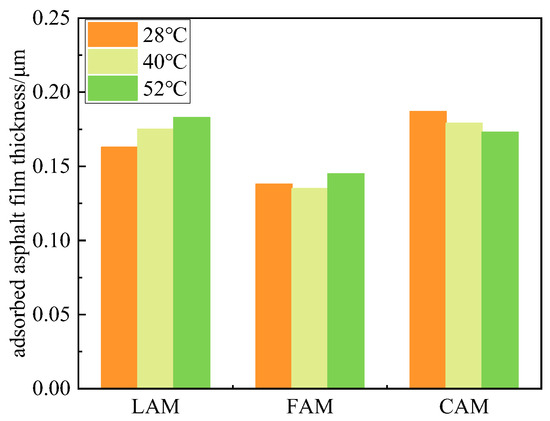 The effect of temperature on the interaction capability between asphalt and mineral fillers was examined by analyzing the variation in adsorbed asphalt film thickness for three types of asphalt mastics, as illustrated in Figure 12.